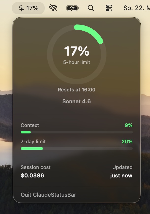 Beim Arbeiten mit Claude Code wollte ich auf einen Blick sehen, wie viel meines 5-Stunden-Plans ich bereits verbraucht habe und was die aktuelle Session kostet – ohne den Workflow zu unterbrechen. Eine native Menüleisten-App ist der ideale Ort für solche Hintergrundinformationen.