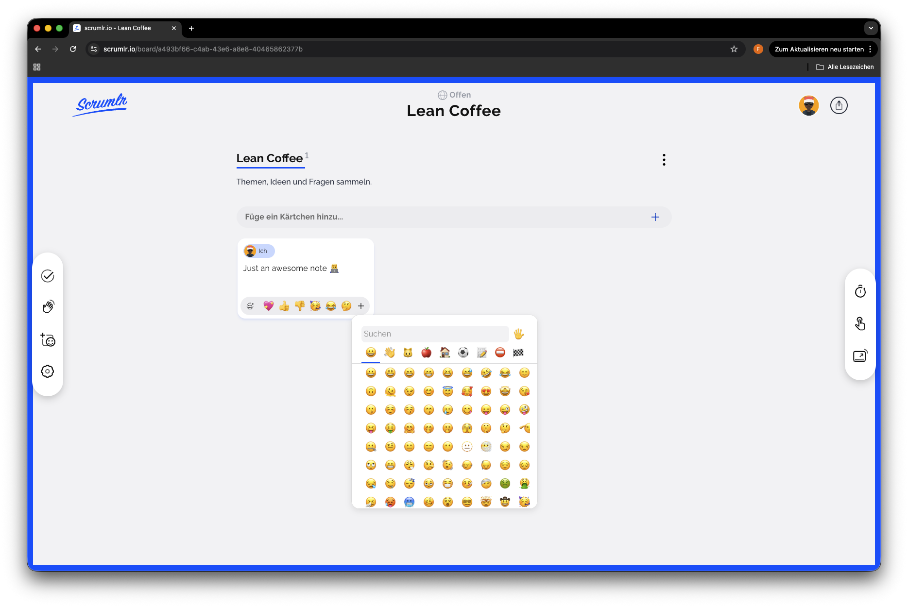 Scrumlr.io ist ein Open-Source Echtzeit-Retrospektive-Tool für agile Teams. Es ermöglicht Teams, gemeinsam Retro-Boards mit Karten, Reaktionen und Abstimmungen zu erstellen und zu verwalten – alles live via WebSockets synchronisiert.